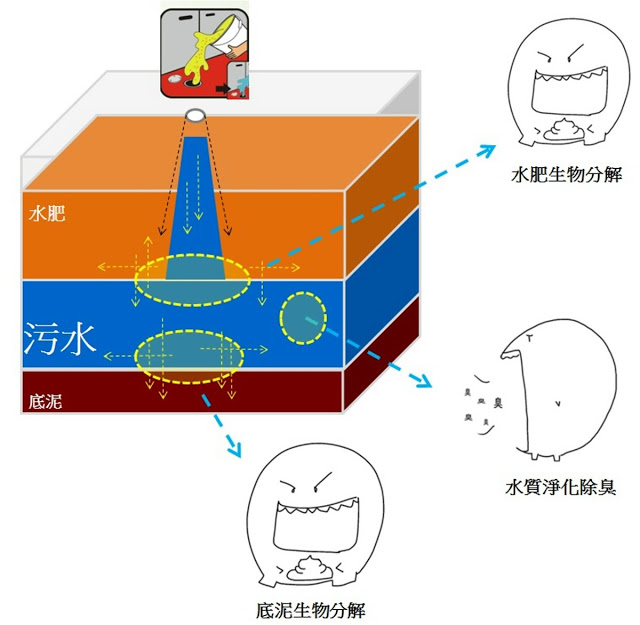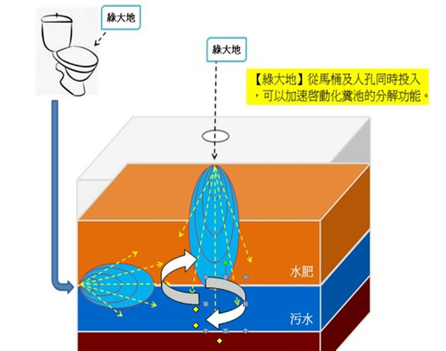 當【綠大地化糞清】持續從人孔投入化糞池時,酵素會先分解人孔附近的『水肥層』,將水肥層分解出一個隧道(如下圖水肥分解圖),此時由人孔可看見污水層水面;然後酵素會進入化糞池『污水層』,在其中擴散開來並淨化水質,消除排水臭味。更多說明請參考【綠大地】官方網站:www.bio-enzyme.com